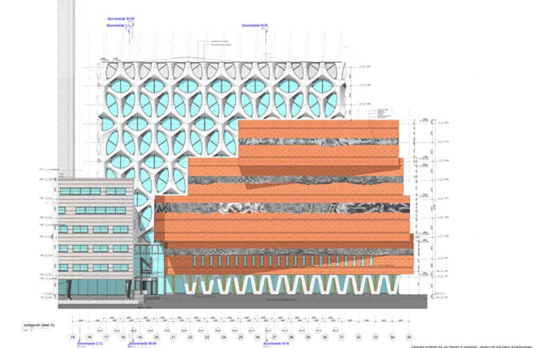 De gestapelde lagen van de museumzalen van Naturalis in Leiden hebben een gevel van rode natuursteen, opgebouwd alsof het dunne aardlagen zijn. De gevel loopt helemaal rondom van buiten naar binnen in het atrium. Deze lagen natuursteen worden onderbroken door banden van witte betonpanelen met een doorlopend driedimensionale reliëfstructuur, geïnspireerd op de collectie van Naturalis en erosiedetails van rotsen naar ontwerp van modeontwerpster Iris van Herpen in opdracht van Neutelings Riedijk Architecten.