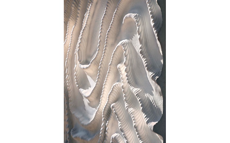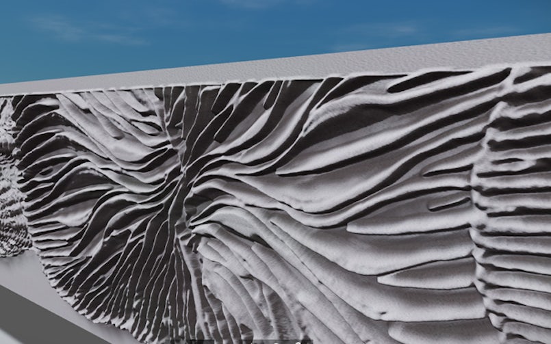 Het digitale model is ook direct door de betonfabrikant Hibex gebruikt om de frees voor de mal aan te sturen. Hier is dus gebruikgemaakt van een doorlopend digitaal proces van ontwerp tot productie. Het oppervlak van de ribben zelf is ook weer geribbeld vanwege de structuur van het freespatroon en de gebruikte freeskop. Zo ontstaat er detail op elk niveau.