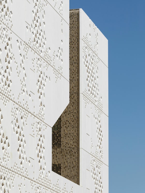 ‘We wilden geen grote ramen aan de straat, vanwege het besloten karakter van de rechtszalen, en het hete klimaat’, zegt projectarchitect Nuno Fontarra over de keuze om het Paleis van Justitie aan te kleden met GFRC-panelen. Naast de ambitie om een gedecoreerde gevel te maken, die zou aansluiten bij lokale (bouw)tradities en een aantrekkelijk beeld biedt vanuit de omringende nieuwbouwwijk, speelde duurzaam materiaalgebruik een belangrijke rol. De mat-witte GFRC-panelen combineren een hoge thermische isolatiewaarde en thermische massa met reflecterende eigenschappen. Om dezelfde reden zijn de geperforeerde panelen niet voor een glazen gevel geplaatst, maar tegen een geperforeerde binnenwand, die veel beter isoleert. Daarmee is de koellast zo veel mogelijk beperkt.