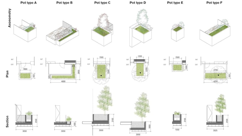 Door slimmigheidjes in het ontwerp en bij de productie van de plantenbakken is nog meer winst behaald: deze zijn met slechts zes verschillende mallen geproduceerd. De volgorde van de bakken wisselt in elke tweede laag en vervolgens zijn laag één en twee in de derde en vierde laag gespiegeld. Dit ritme herhaalt zich elke vier verdiepingen.
