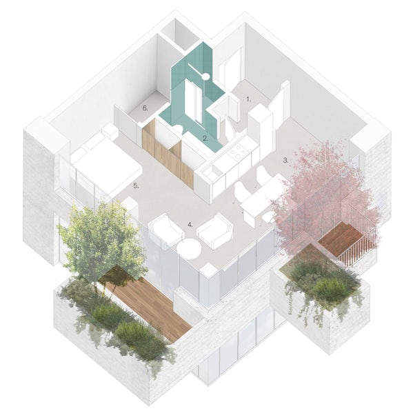 Uitgangspunt van de architect was dat bij iedere loft tenminste één boom kwam te staan.