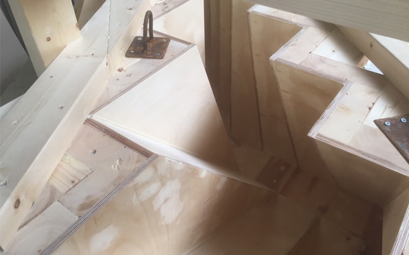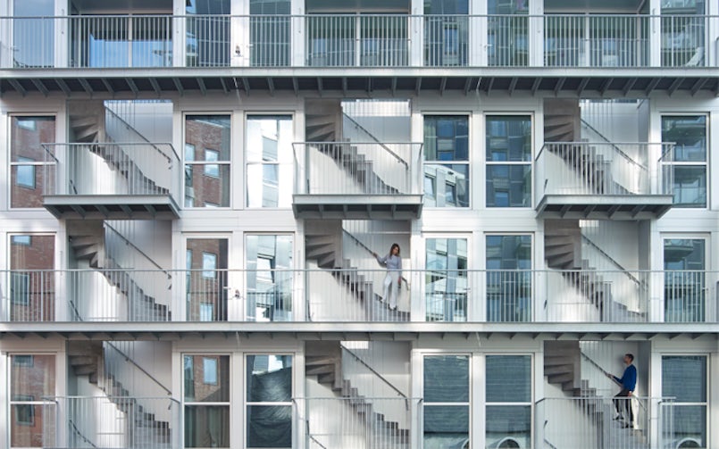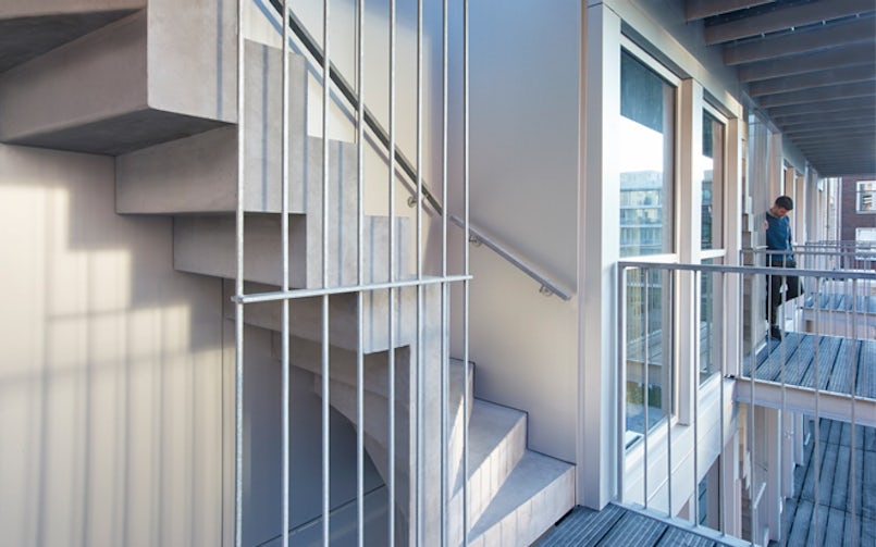 Het idee van vluchttrappen aan de buitenzijde en verticaal geschakelde woonruimte appelleert aan de schaal en het architectonisch ritme van woningen in steden zoals New York. Met een plint plus hoogbouw, en een strak verticaal ritme. Groot verschil met de Big Apple is dat de trappen in Amsterdam niet van metaal, maar van robuust beton gemaakt zijn. Een complexe opdracht, die samenhangt met het feit dat zowel de betonnen trappen in de woningen, als de vluchttrappen aan drie kanten in het zicht zitten. Daardoor moesten zij op hun kant gestort worden, met de zijkant die in het zicht komt aan de bovenzijde van de prefab mal. Eenvoudigere trappen, met een enkele draai, zijn in een keer gestort. Sommige trappen zijn complexer door een dubbele draai. In dat geval moesten diverse maldelen aan elkaar gekoppeld worden.