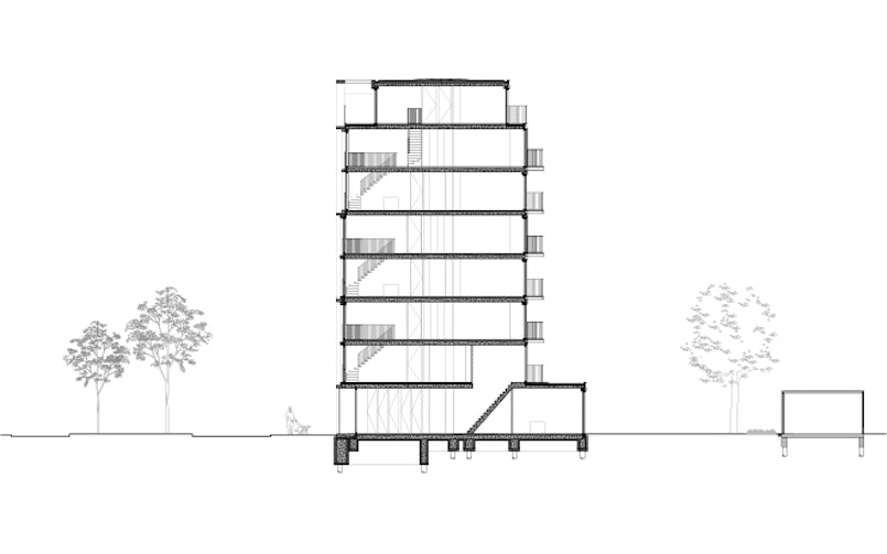 Die uitwendige vluchtroute komt mede voort uit de centrale vraag bij een dergelijk zelfbouwproject: hoe combineer je drie particuliere kavels met een geringe breedte tot één architectuur, terwijl ze wettelijk gezien in de typologie toch echt eigen kavels moeten blijven? Dus met een eigen parking, ontsluiting via een lift én een vluchtweg? Door te kiezen voor situering aan de buitenzijde van het complex, kon worden voorkomen dat deze ontsluiting een al te grote hap uit de toch al vrij krappe plattegrond zou nemen. Bovendien staan de drie trappenhuizen met elkaar in verbinding, waardoor bewoners in geval van nood ook heel gemakkelijk de trap van de buren kunnen gebruiken.
