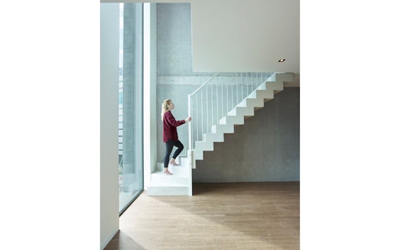 Zo ook in het Amsterdamse Amstelkwartier. Het resultaat is een kleinschalig georganiseerde stadswijk, met daarin zelfbouwprojecten zoals Vertical Lofts: een wooncomplex met negen lofts ontwikkeld door drie bevriende particulieren, gerealiseerd op drie smalle zelfbouwkavels. De kavelvorm en de strenge envelop inspireerden studio PROTOTYPE tot het ontwerpen van een bijzondere plattegrond: je vindt hier drie woningen boven elkaar, elk met twee verticaal aan elkaar geschakelde leefruimten. Daarbij is de vluchtroute buiten de woningen gesitueerd, via betonnen trappen in een nis aan de achterzijde.