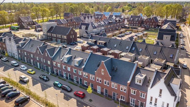 Het prefab betonsysteem van Voorbij liet de mogelijkheid om de breedte en diepte van de woningen te variëren (tussen 4,8 en 6,3 m). “De meeste huizenblokken liggen in noord-zuidrichting”, legt Bosch uit. “De woningen die de ochtendzon krijgen, hebben we iets smaller (5,4 m) gemaakt met diepe achtertuinen en een strook voor het huis waar je ‘s ochtends koffie kunt drinken. “De woningen met avondzon zijn extra breed (6,3 m), met een ondiepere tuin en aan de voorzijde een groot terras. Die buitenruimtes zijn belangrijk voor de opbouw van de wijk, en de levendigheid.” Naast woningen van twee lagen en een kap hebben we ook drielaagse woningen gemaakt, die we een kwartslag draaien op de hoek. Dat soort varianten geven schwung aan de stedenbouw.”