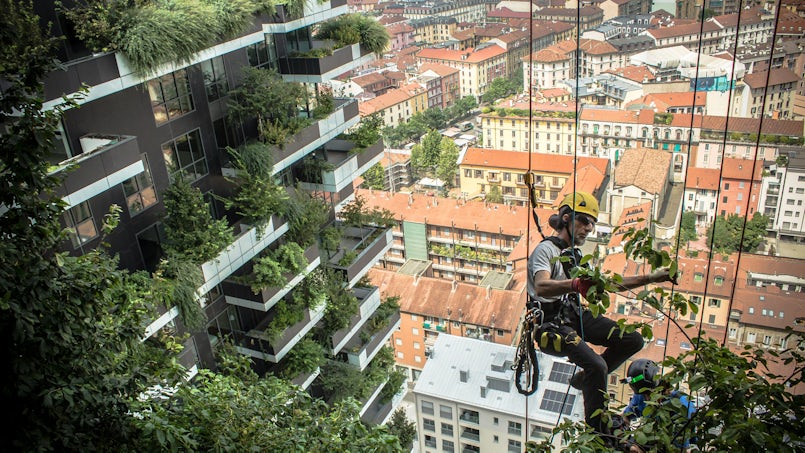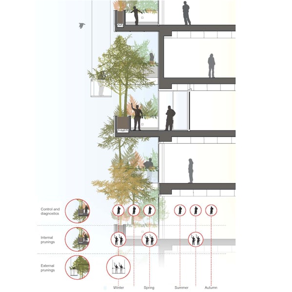 De twee woontorens herbergen ongeveer 800 bomen, 4.500 struiken en 15.000 planten, zorgvuldig afgestemd op de bezonning en de windbelasting van de gevels. Cruciaal voor het slagen van het project was het vinden van een veilig constructiesysteem, geschikt voor volgroeide bomen.