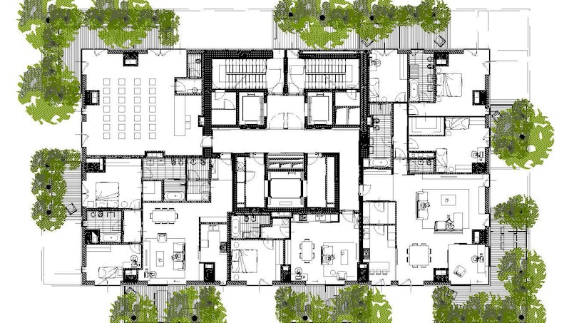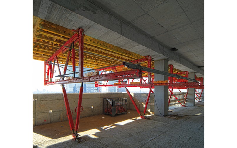 De vloervelden grenzend aan de overkragingen zijn in het werk nagespannen met een ongebonden naspansysteem. Zodoende is de diepte van de elementen geoptimaliseerd en is de doorbuiging onder de potten te beheersen. De betonnen vloerplaat van de balkons is gelaagd: bedekt met een waterdichte folie op een isolatielaag. Daarop staat een lichtgewicht dekvloer van grijze keramische tegels (RAL 7040) van 60 bij 60 cm.