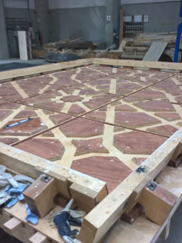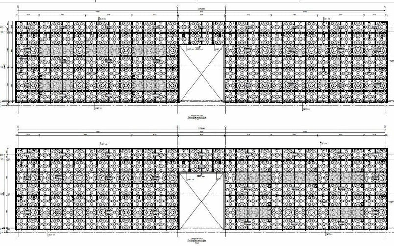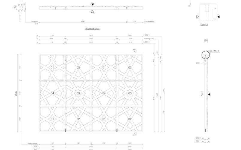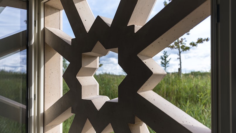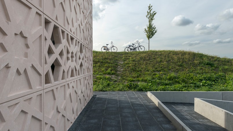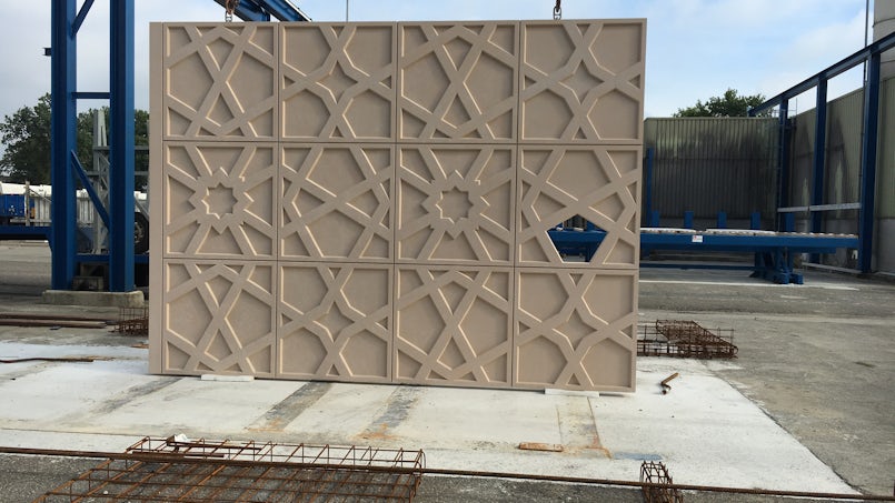 Deze rasters zijn elk 1,20 m x 1,20 m. Tezamen vormen de vier delen een element van 2,40 m bij 2,40 m. Om ervoor te zorgen dat de patronen duidelijk naar voren kwamen, moest het omliggende beton 5 cm lager komen te liggen. Bovendien moest een deel van het lager liggende vlak worden opengewerkt, zodat de schil waar nodig lichtdoorlatend werd. Om dit te realiseren zijn voor het gietproces drie mallen op maat gemaakt: twee voor de wanden en een aparte mal voor de minaret. De totale productie heeft circa veertien weken geduurd.