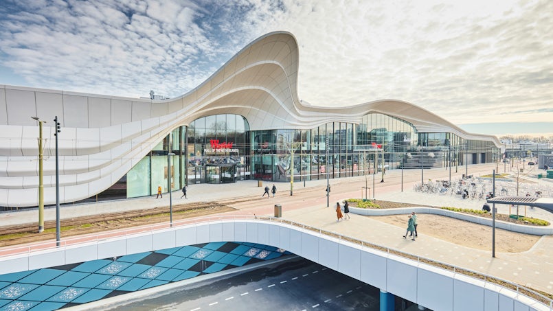 Eye-catcher van de Westfield Mall of the Netherlands is de gevel: hagelwitte prefabelementen van glasvezelversterkt beton (HPC) zijn sierlijk om het winkelcentrum heen gedrapeerd, als een grote voile. Een vernuftig ontwerp van MVSA Architects, dat kon worden gerealiseerd dankzij 3D-engineering, en gebruik van innovatieve (flexibelle) mallen.