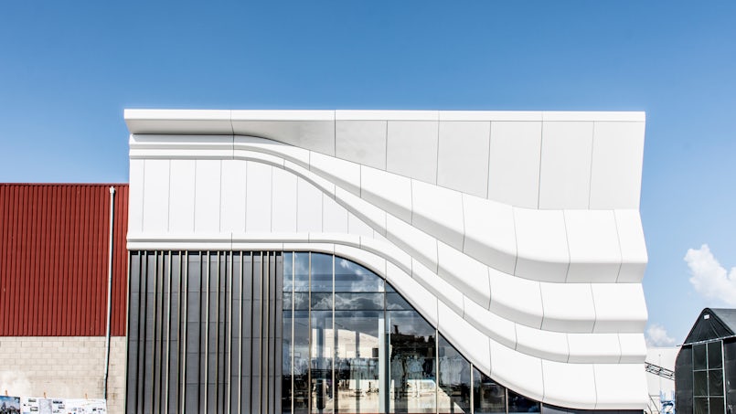 Qua materiaalkeuze werd gedacht aan beton of composiet. Om een keuze te kunnen maken, zijn proefstukken gemaakt, die aan diverse tests zijn onderworpen. Senior architectural engineer Mark Ohm: ‘Naast de proefstukken hebben we ook gekeken naar twee referentieprojecten: beiden met ronde vormen, maar een met composietgevel en de ander met betongevel. Beton heeft de gewenste look en feel en voldoet aan de verwachte duurzaamheidseisen.’
