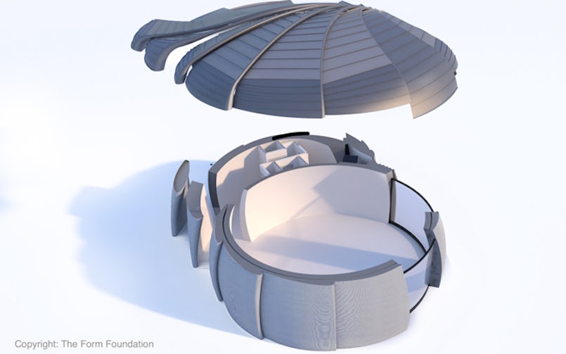 In het ontwerp van de Vergaderfabriek stelde het ontwerpteam rondom Pim van Wylick van The Form Foundation zich de uitdaging om dubbelgekromde vlakken te printen. Hierbij wilde Pim een zo groot mogelijke offset* realiseren. Het ontwerp is afgeleid van de rotorbladen van een vliegtuig, inspiratie van het nabijgelegen vliegveld Teuge. De ruimte moet rond zijn vanwege het panorama-beeldscherm dat de opdrachtgever in de vergaderzaal wil realiseren.
