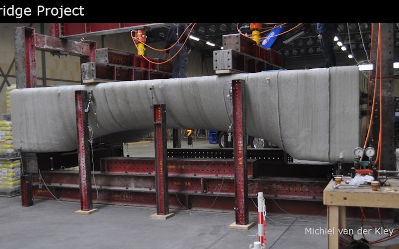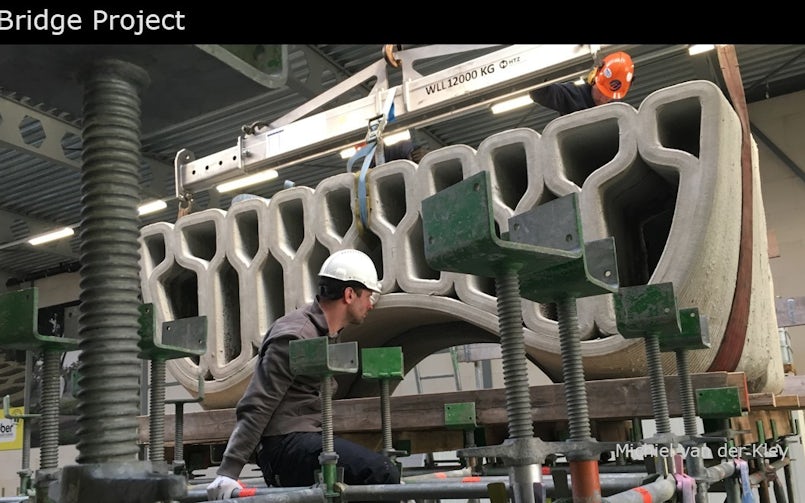 Vervolgens worden de aannames en berekende mogelijkheden getoetst in de praktijk, o.a. met de eerste betongeprinte fietsbrug in Gemert en recent voor de brug van Nijmegen.