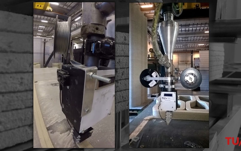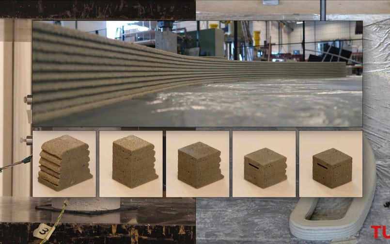 Daarnaast heeft hij onderzoek gedaan naar ‘structural concrete’, zoals het stabiliseren van de constructie met zand, zodat er een grote offset* te realiseren is; het toevoegen van vezels en het effect van het met de printerkop laten meelopen van een ijzerdraad als wapening.