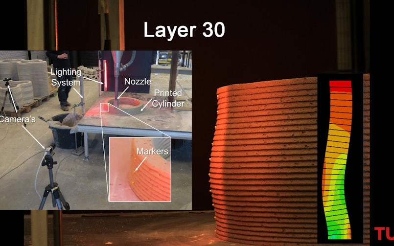 Rob Wolfs nam ons mee in zijn promotieonderzoek en liet zien met welke onderzoekslijnen de TU Eindhoven bezig is. Rob heeft een model ontwikkeld dat laat zien wat de krachten zijn op de constructie wanneer de stapeling van lagen teveel wordt voor het nog niet uitgeharde beton waardoor de onderste lagen gaan ‘uitbuiken’.
