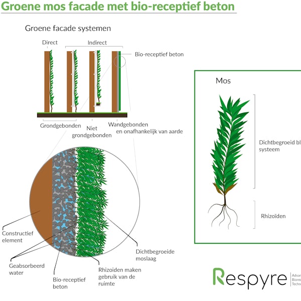 Soms lukt het mos onder specifieke omstandigheden op beton te groeien. Normaliter is dit geen goed teken, het wijst op versleten en poreus beton dat of oud of verkeerd gestort is. Toch was dit de inspiratie voor de ontwikkeling van een bio-receptief beton. Respyre, een start-up afkomstig van Delft Enterprises, heeft in samenwerking met de TU Delft dit bio-receptief beton ontwikkeld. Het oppervlak van dit beton moedigt de groei van mos juist aan.