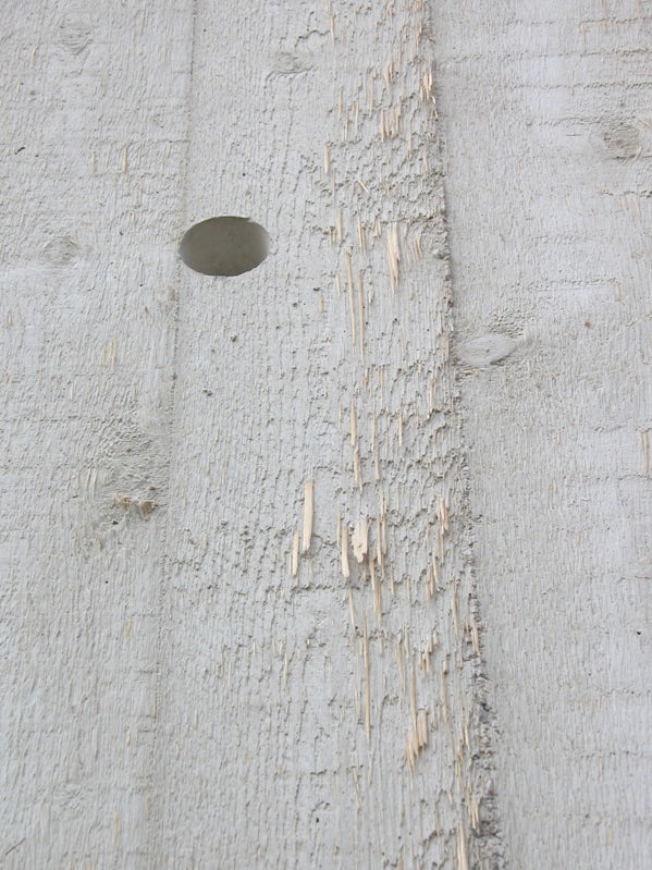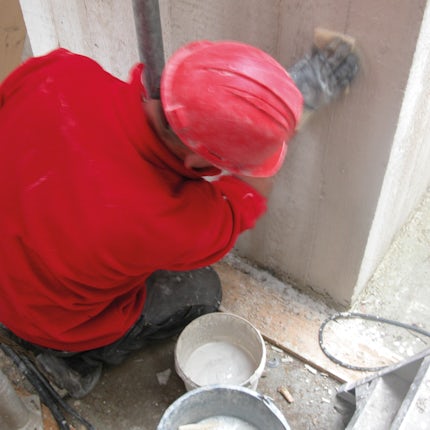 De schoonbetonwand laat direct na het ontkisten nog splinters zien van de grof gezaagde Siberische planken bekisting. Er vindt een nabewerking plaats van poetsen en schuren van de wand met esthetische mortel.