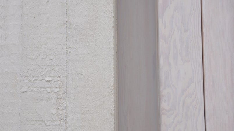 Ontwerpend vanuit de locatie heeft de architect voor de wanden van zowel het exterieur als het interieur gekozen voor een bekisting met ruwe houten delen van 150 mm breed. Daarbij zijn alle bekistingselementen gekalibreerd op een zuivere breedte. Om de gewenste ruwe afdruk van de houtstructuur in het beton te krijgen, is gekozen voor Siberische planken. Niet de kwaliteit of sterkte van het hout, maar de ‘oude’ Siberische zaagmachines hebben tot deze keuze geleid. Deze machines zagen de bomen tot minder gladde planken en dat leidt uiteindelijk tot de gewenste grovere structuur in het beton.