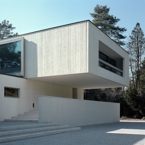 Vanuit een rustige bosweg in Waalre sta je ineens oog in oog met een villa in wit beton die niet zou misstaan in de nieuwste James Bond film. “Niet alleen het ontwerp van deze villa – in vorm en afmeting – is spectaculair, maar vooral ook de uitvoering en de detaillering”, aldus Henk Oude Kempers, adviseur schoonbeton. Zowel het exterieur als het interieur is volledig uitgevoerd in spierwit beton. Door de eenvoud van het ontwerp roept dit een beeld op van Zwitserse architectuur.