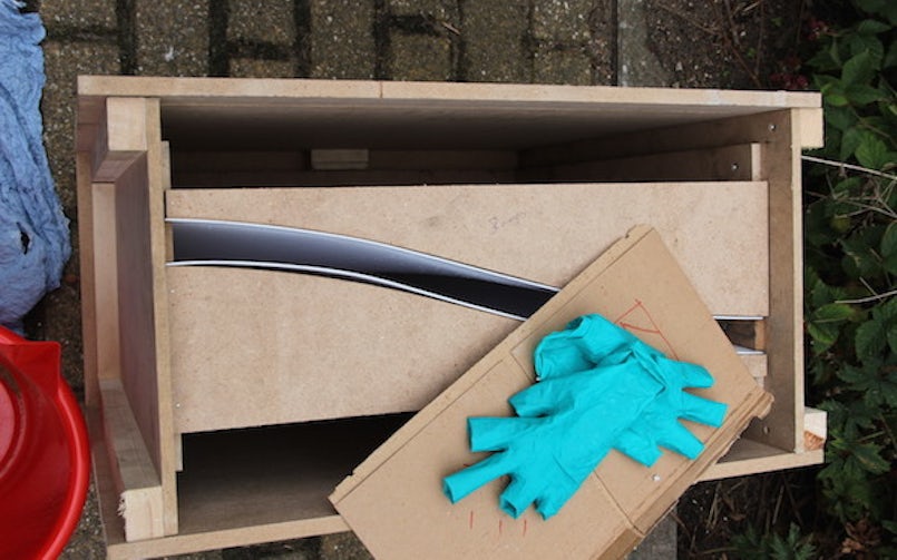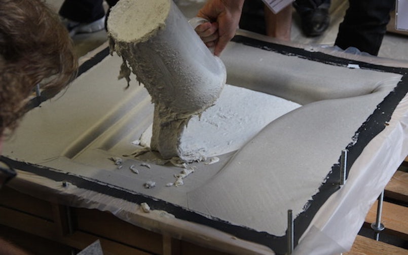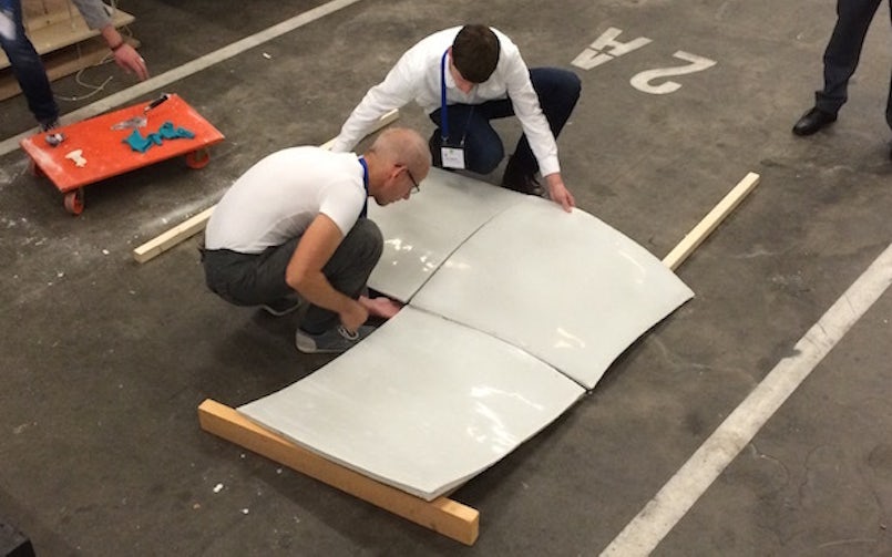 Cruciaal in met name de techniek uit workshop 1 (dubbelgekromde panelen) is het moment van opstijven van het beton. Het element wordt namelijk in zijn specifieke positie geplaatst, nadat het beton al is aangebracht. Het klinkt wellicht Cruyffiaans, want: Gebeurt dit te vroeg, dan is het beton nog te vloeibaar en zal het wegvloeien naar de lagergelegen punten. Gebeurt het te laat, dan is het beton al te hard en kan de vorming scheuren opleveren.